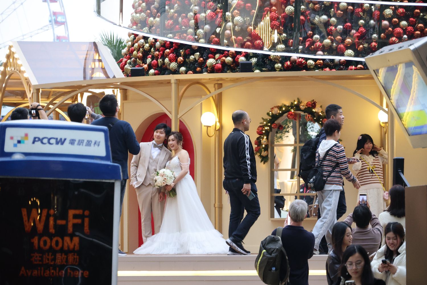 图为民众在冬日小镇拍摄婚纱照。图片来源:香港中通社