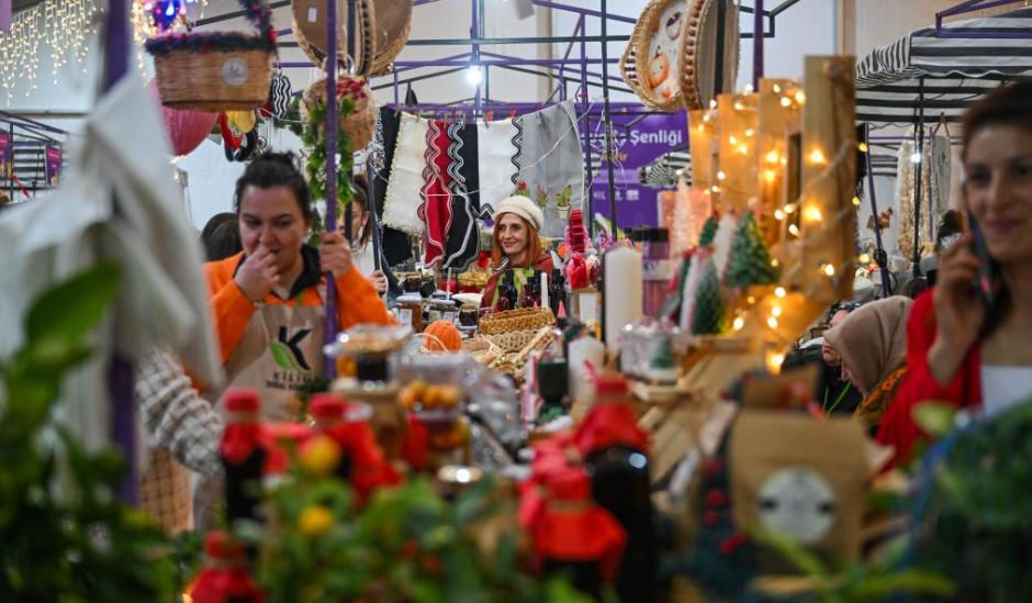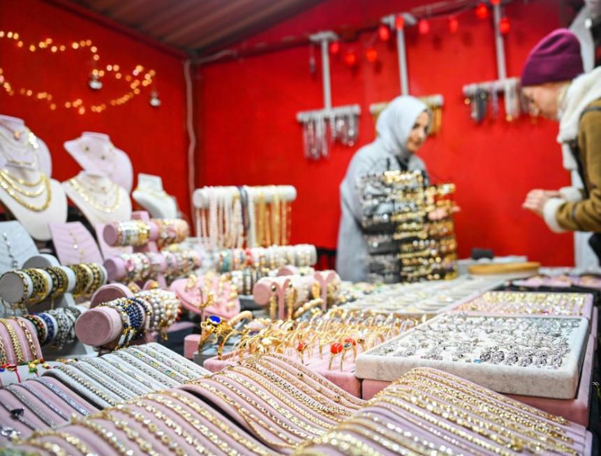 这是12月17日拍摄的土耳其伊斯坦布尔加拉塔港钟楼广场新年购物节一角。随着新年临近,土耳其伊斯坦布尔加拉塔港的钟楼广场搭建好帐篷举办新年购物节,售卖与节日相关的商品。图片来源:新华网