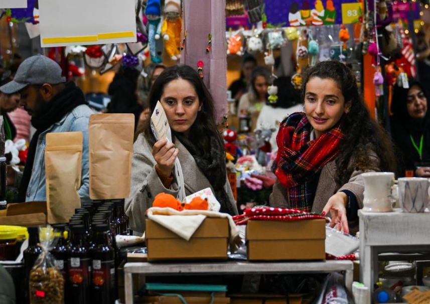 12月17日,顾客在土耳其伊斯坦布尔加拉塔港钟楼广场新年购物节上选购商品。图片来源:新华网