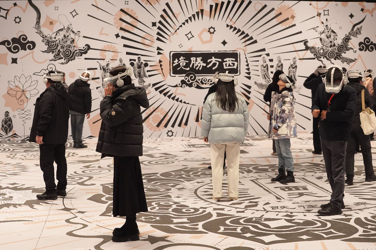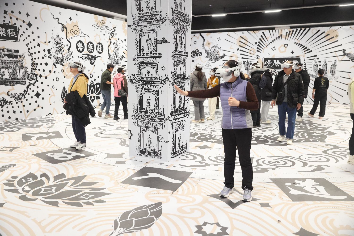 图为观众戴着VR眼镜感受数字化小西天悬塑。图片来源:中新社
