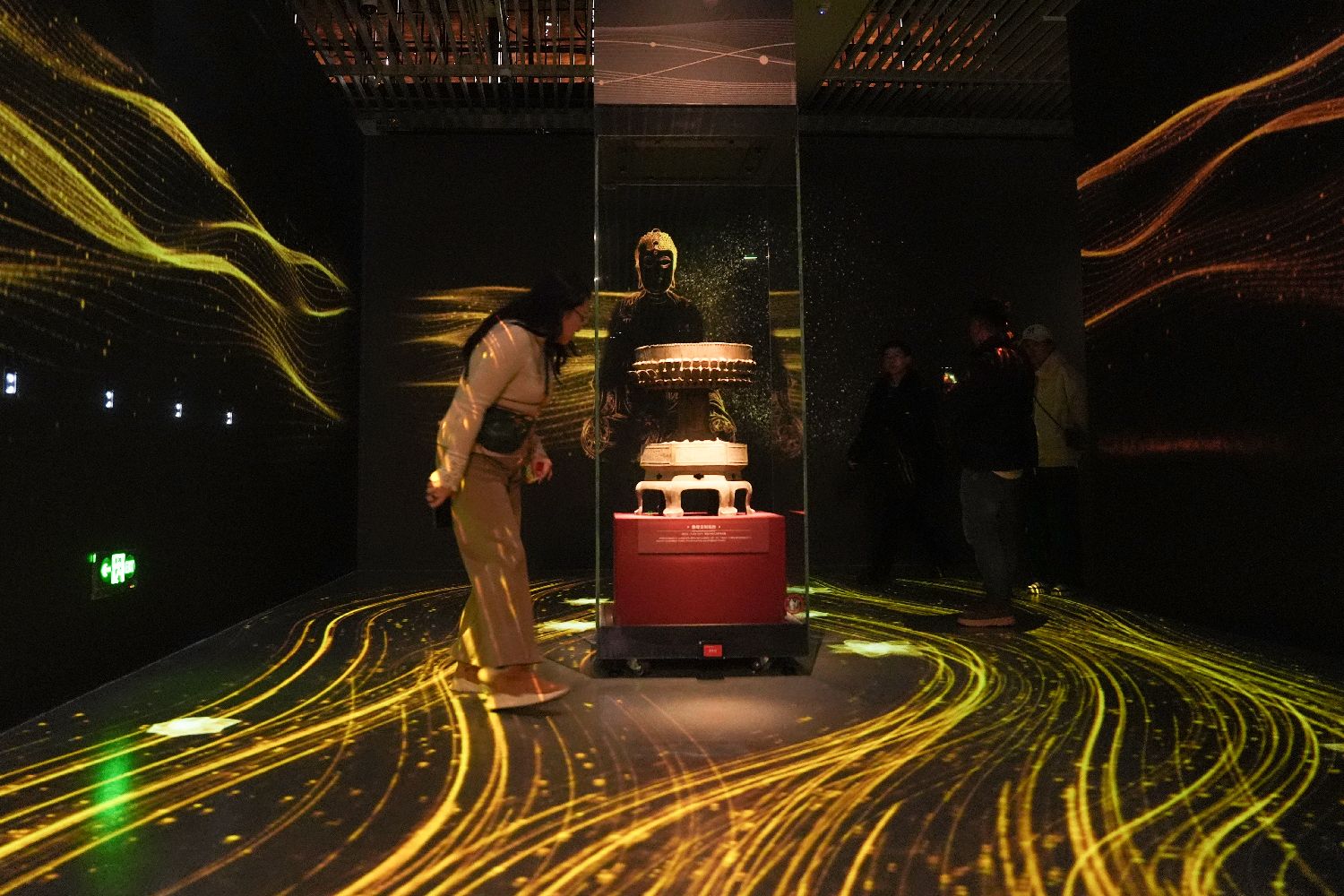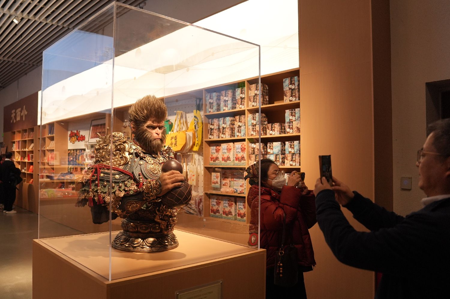 图为《黑神话·悟空》天命人半身像等文创产品吸引嘉宾。山西隰县小西天是《黑神话·悟空》的取景地。图片来源:中新社