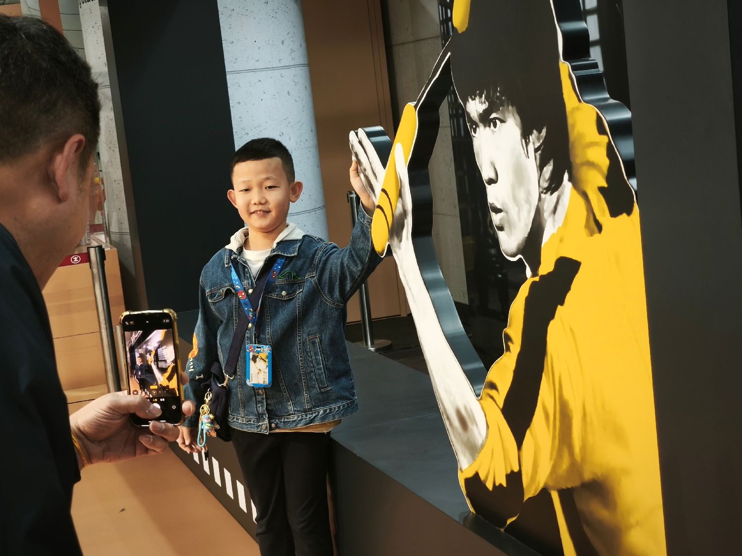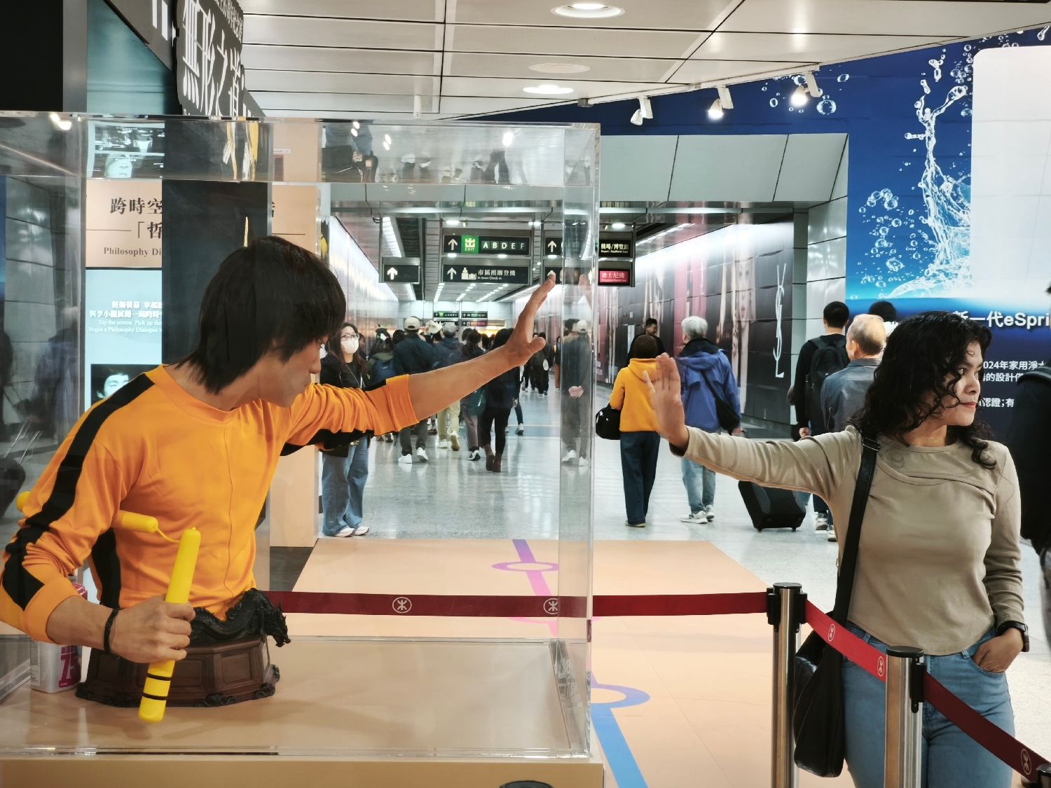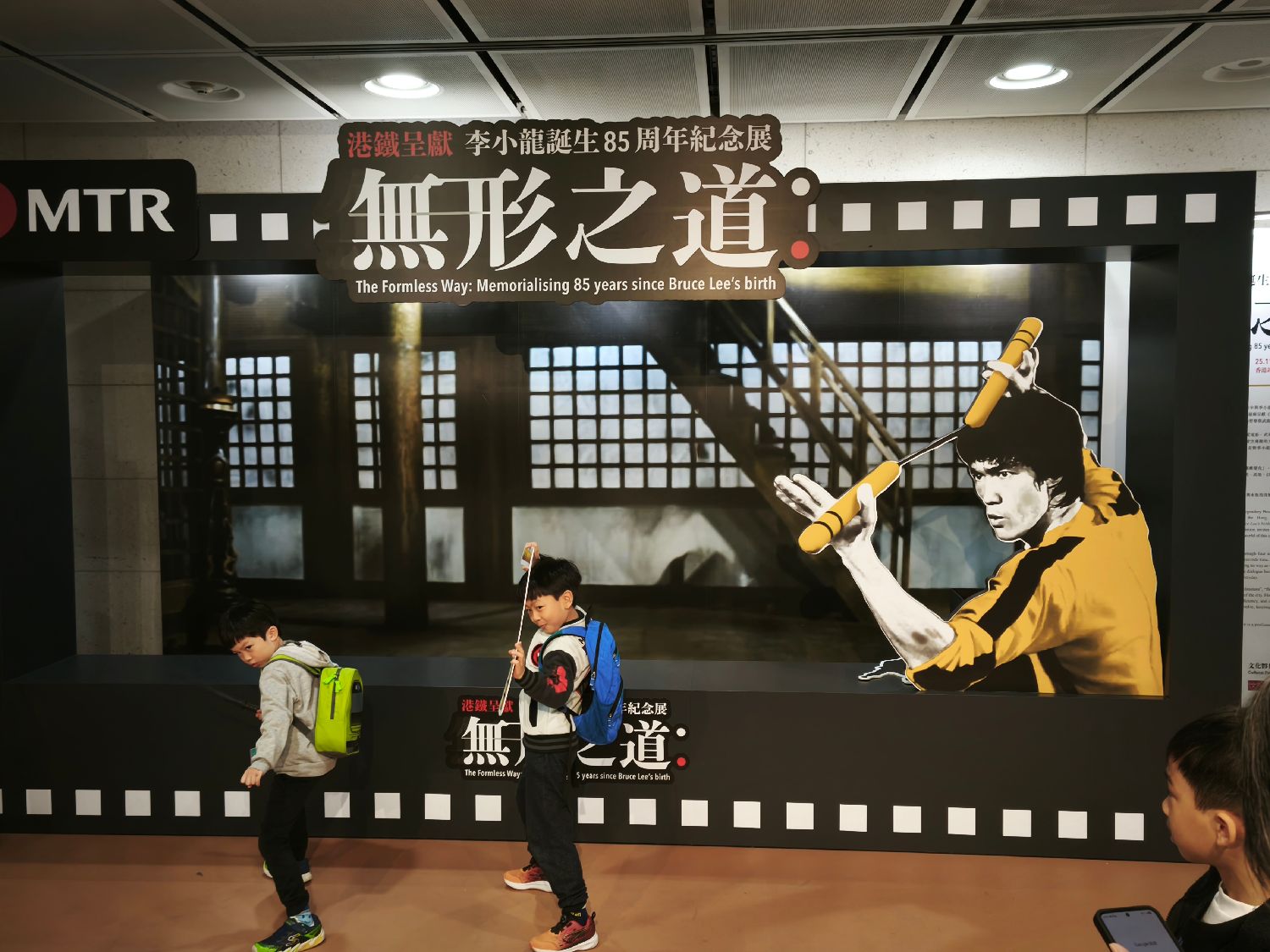 圣诞节期间,乘客在香港中环地铁站李小龙展拍照参观。今年是传奇巨星李小龙诞生八十五周年,港铁公司联同李小龙基金会及香港文化博物馆,由11月25日起举办《李小龙诞生85周年纪念展:无形之道》,展现这位成长于香港的一代宗师在电影、武术、哲学及艺术的深厚思想和内涵。图片来源:香港中通社