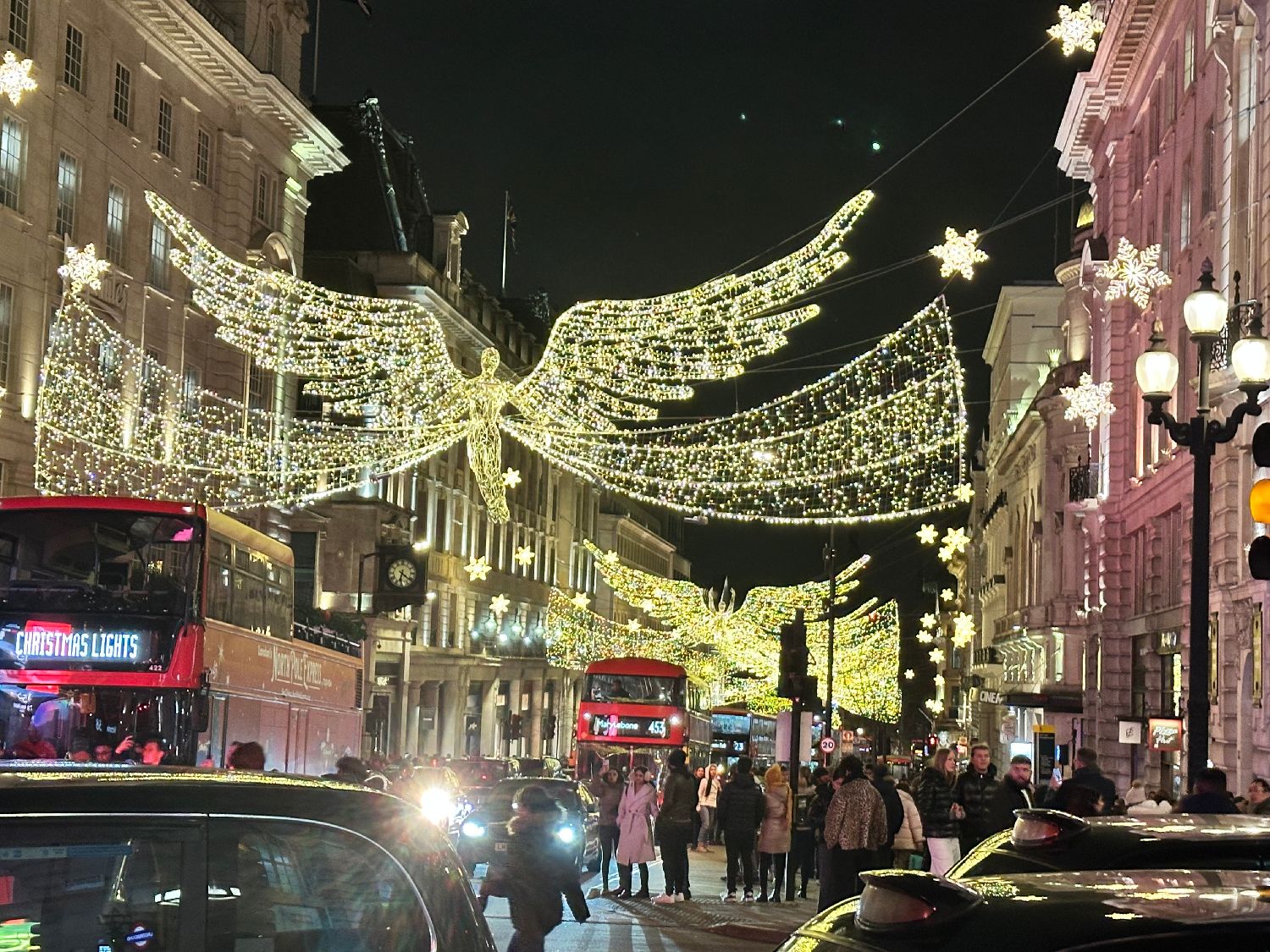 当地时间12月27日晚,英国伦敦市中心皮卡迪利广场附近行人如织,临近2025年年末,街道上亮起多彩灯饰,当地居民在璀璨灯光中迎接新年。图片来源:中新社