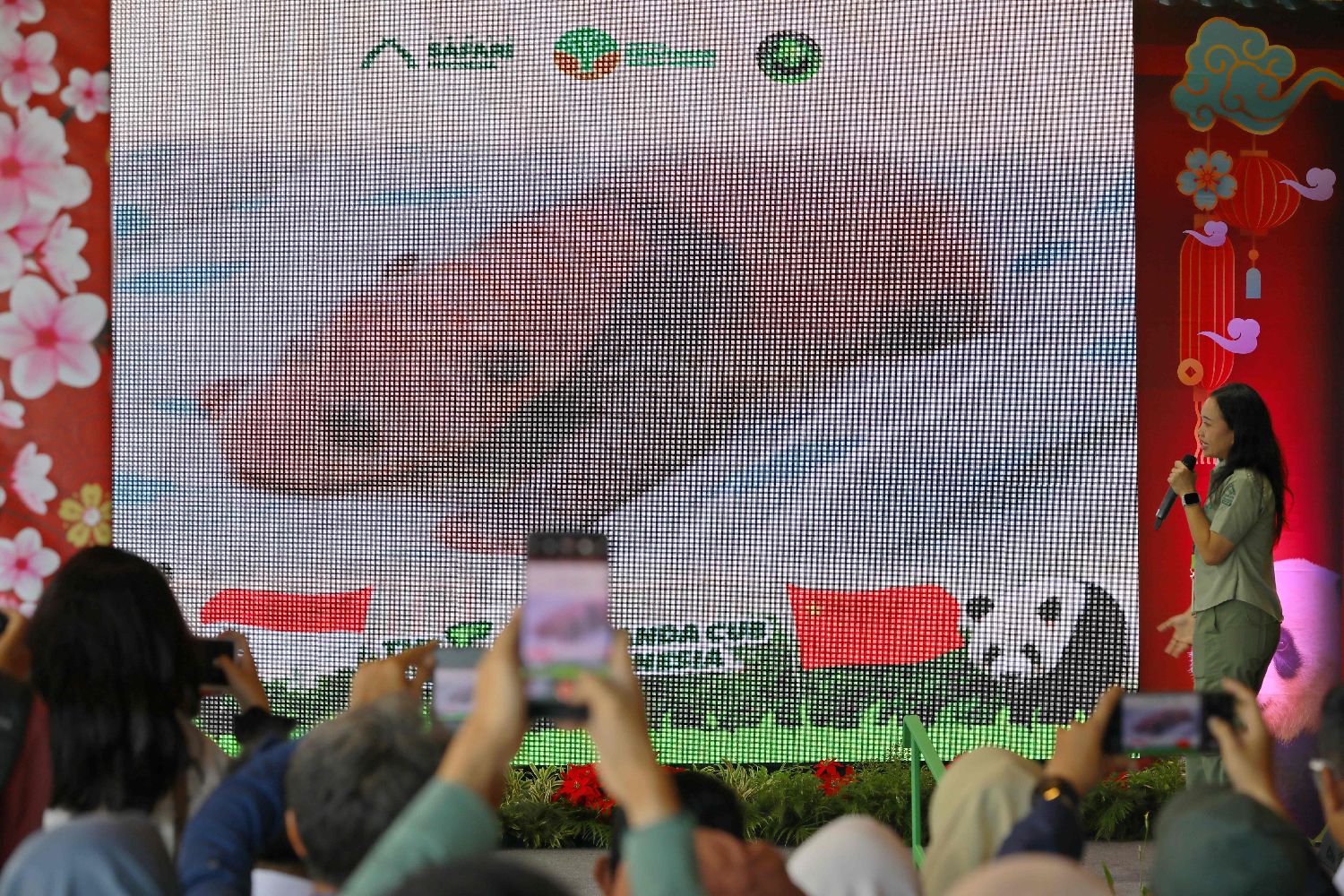 当地时间1月6日,印度尼西亚西爪哇省茂物野生动物园举行“新出生大熊猫幼仔媒体发布会”,现场大屏幕播放大熊猫幼仔视频。图片来源:中新社