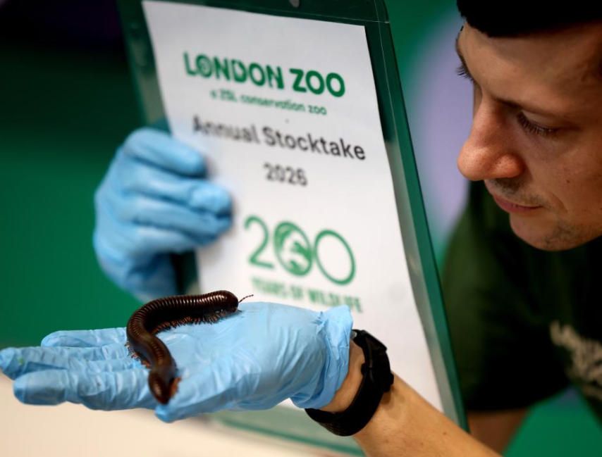 1月6日,在英国伦敦动物园,一名工作人员对千足虫进行盘点。图片来源:新华网