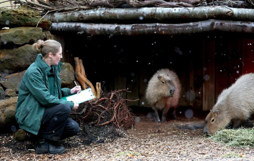 1月6日,在英国伦敦动物园,一名工作人员在雪中对水豚进行盘点。图片来源:新华网