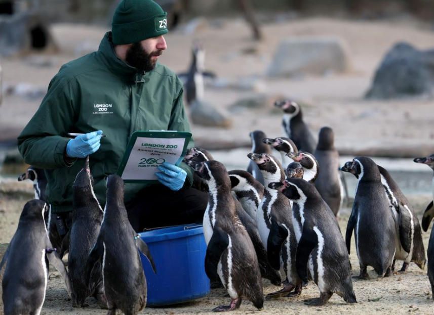 1月6日,在英国伦敦动物园,一名工作人员对企鹅进行盘点。当日,英国伦敦动物园对园内饲养的动物进行一年一度的大盘点。图片来源:新华网