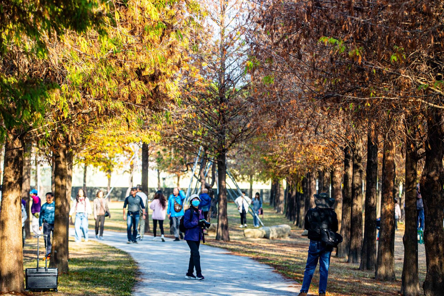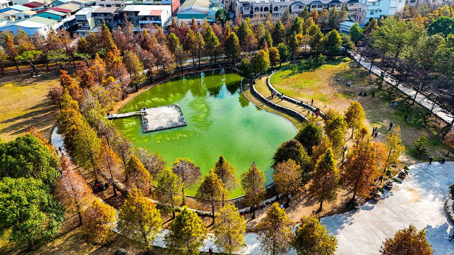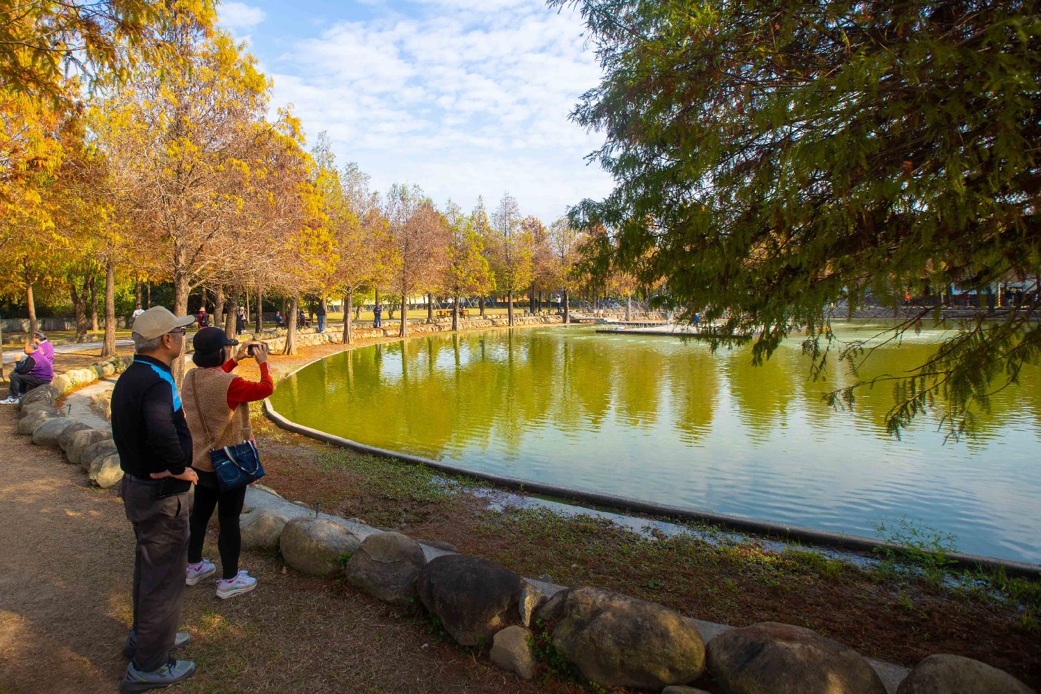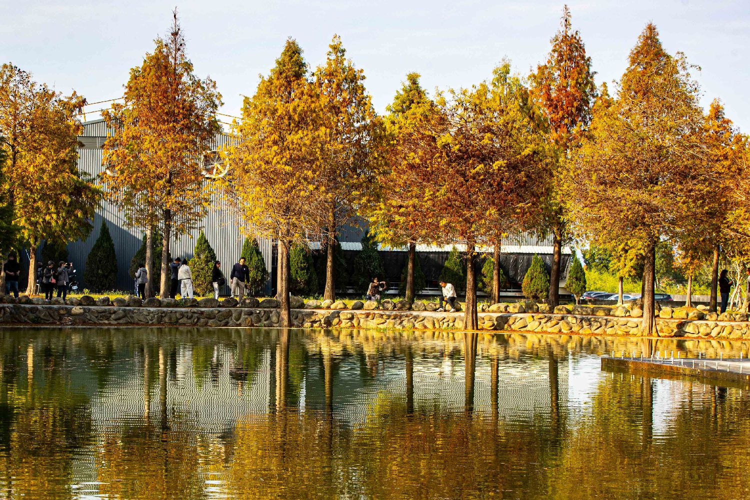 位于台湾南投名间乡繁忙的台3线旁,占地破万坪的落羽松秘境,目前已进入最佳观赏期,园内种有数百棵落羽松,已由绿转红,夹道成荫的羽落隧道,以及倒映湖面的落羽松,景色迷人。图片来源:香港中通社