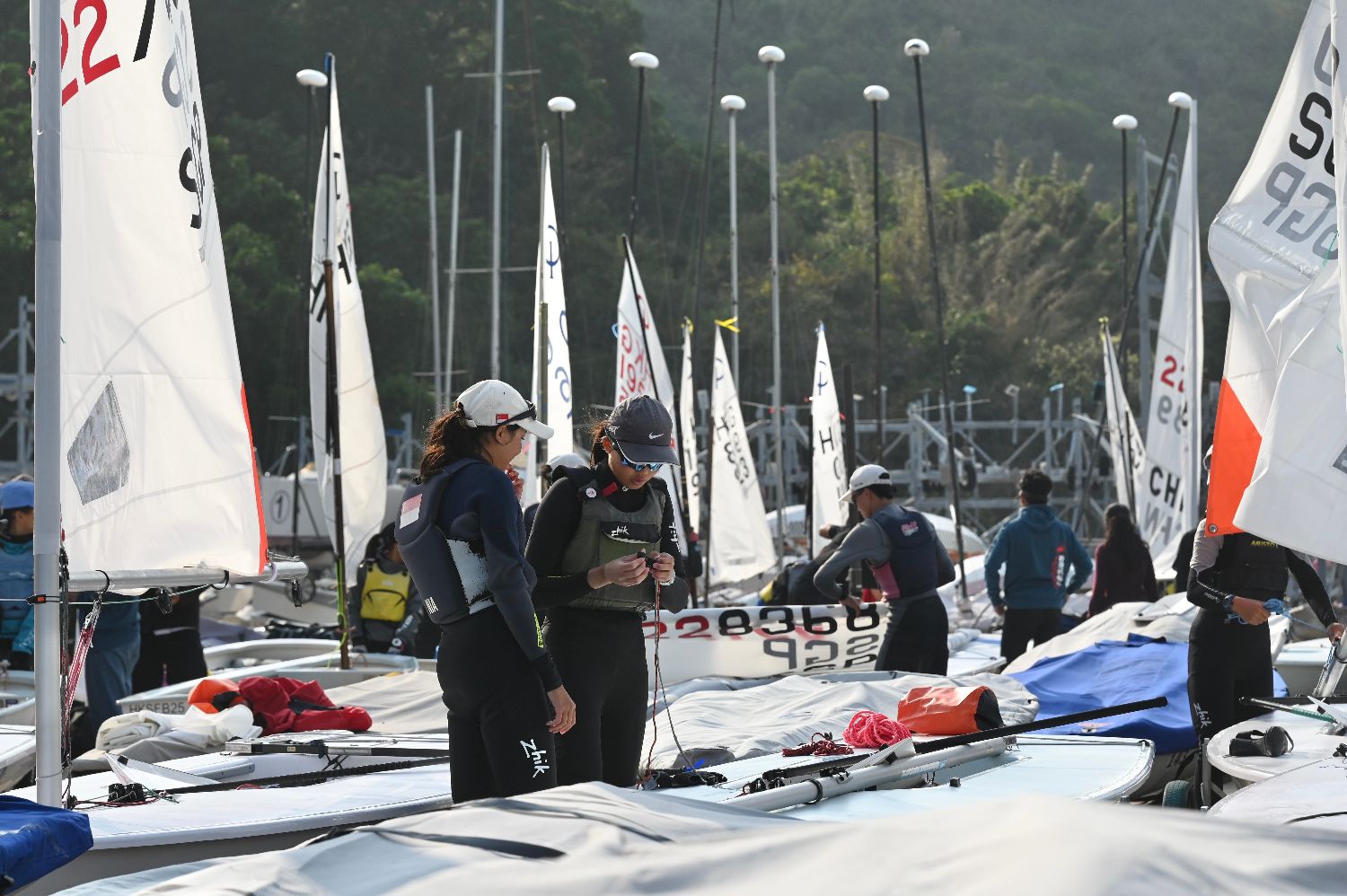 图为参赛选手在岸上整理帆船。图片来源:中新社