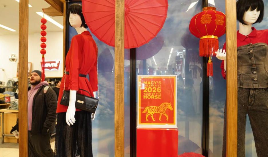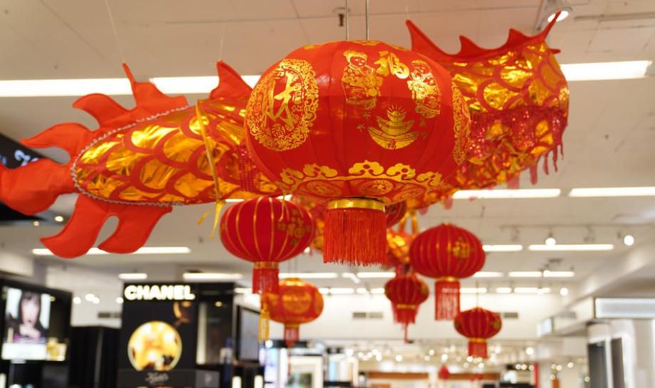 这是2月4日在美国纽约皇后区法拉盛一家商场内拍摄的春节装饰。近日,在美国纽约皇后区法拉盛,春节主题装饰和商品在一些商场和街边商铺出现,增添了喜庆的节日氛围。图片来源:新华网