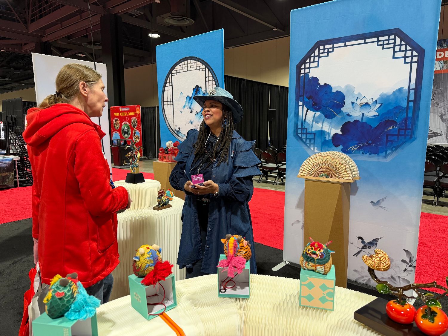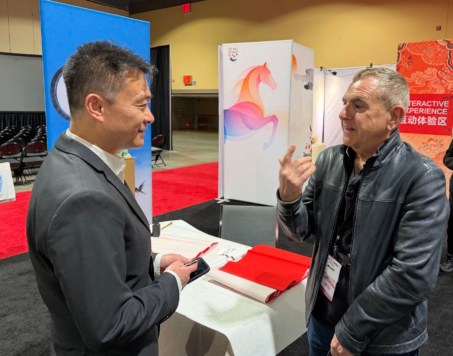 图为中国驻洛杉矶旅游办事处主任吴大伟(左)在中国展区内同当地媒体代表交流。图片来源:中新社