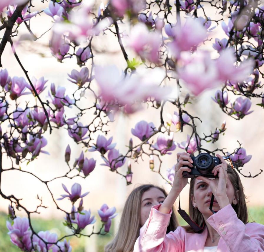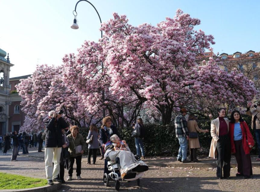 3月13日,市民在意大利米兰赏玉兰花。眼下正值意大利米兰玉兰花花期,人们趁着晴好天气出门踏青,赏花休闲。图片来源:新华网
