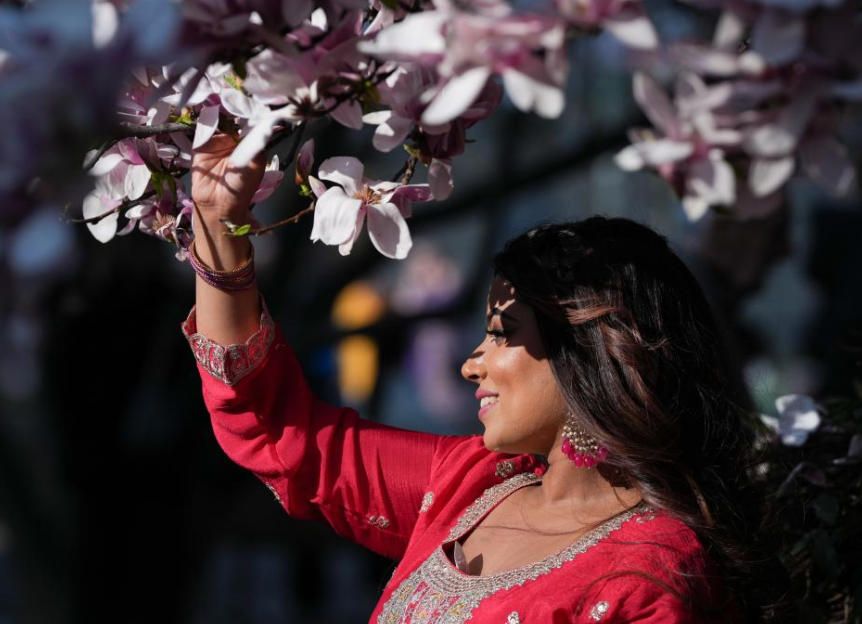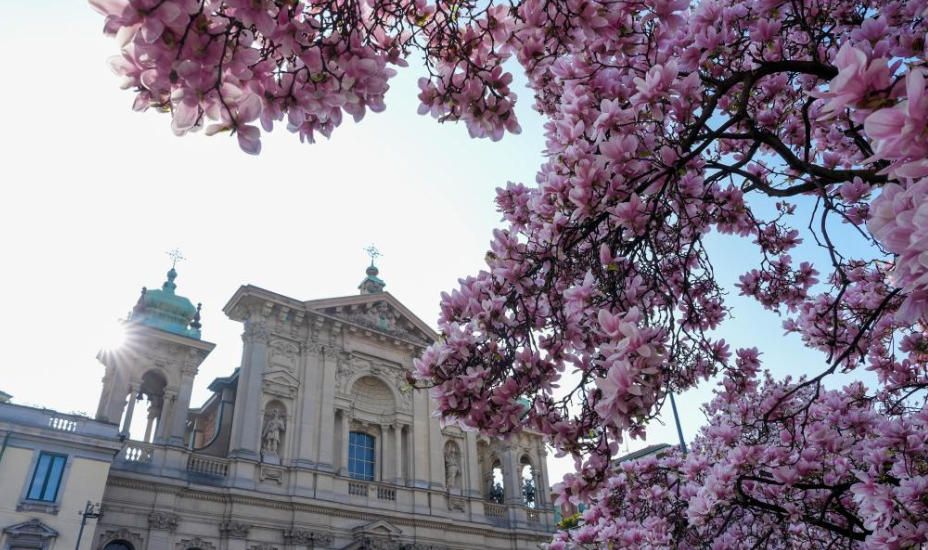 3月13日,在意大利米兰,市民与玉兰花合影。图片来源:新华网