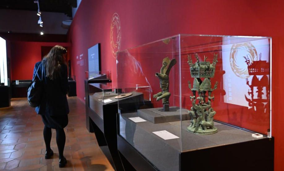 3月17日,在西班牙瓜达拉哈拉博物馆,一名女子参观中国西南地区青铜文明展。图片来源:新华网