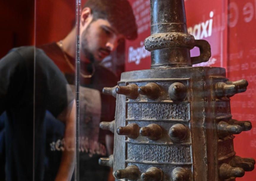 3月17日,在西班牙瓜达拉哈拉博物馆,一名男子参观中国西南地区青铜文明展上来自贵州的展品铜甬钟。图片来源:新华网