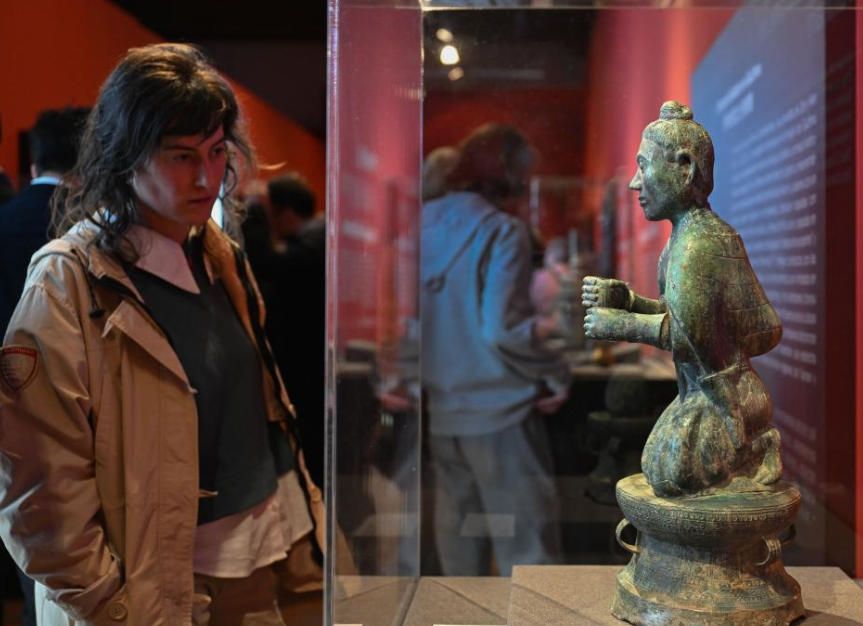 3月17日,在西班牙瓜达拉哈拉博物馆,一名女子参观中国西南地区青铜文明展上来自云南的展品执伞男铜俑。图片来源:新华网