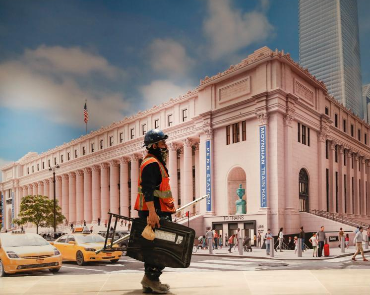 当地时间1月2日,工程人员走过纽约宾夕法尼亚火车站莫尼汉车站大厅内张贴的纽约邮政总局大楼全貌图。宾夕法尼亚站是纽约最繁忙火车站,莫尼汉车站大厅是该站的扩建工程,工程建设历时3年耗资16亿美元,于2021年元旦交付使用。(图片来源:澳洲网)