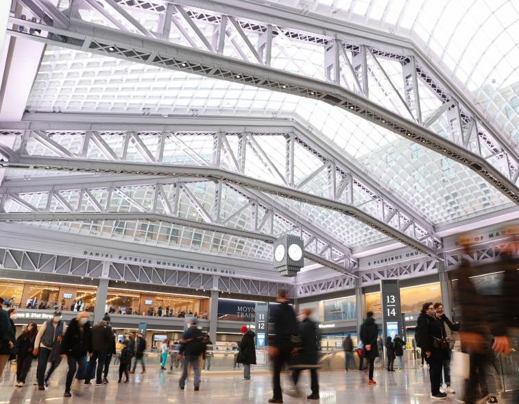 当地时间1月2日,乘客穿梭在纽约宾夕法尼亚火车站莫尼汉车站大厅。莫尼汉车站大厅与原宾夕法尼亚火车站一街之隔,系由纽约邮政总局大楼的邮件分拣区改建而成。如今,具有一百多年历史纽约邮政总局大楼邮政和铁路枢纽功能并行。(图片来源:澳洲网)