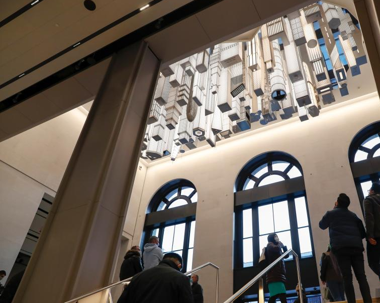 当地时间1月2日,乘客观赏纽约宾夕法尼亚火车站莫尼汉车站大厅倒置在天花板上的装置艺术作品。(图片来源:澳洲网)