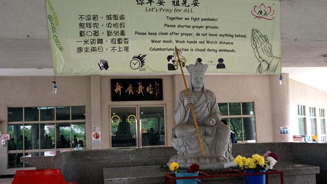 广东义山还未雨绸缪,早早就制定了严格的防疫措施。当天天刚蒙蒙亮,义山工作人员就进行了消毒工作。民众在进入义山前需要扫码登记,并在进入后严格按照规定动线行动且保持社交距离。按照当地风俗,马来西亚华人在扫墓祭祖前要先拜土地神——大伯公。由于大伯公庙宇空间有限,广东义山今年不开放民众进入庙宇内祭拜,前来扫墓的民众排队经过庙前香炉上香,向神灵表达心意。由于广东义山墓园广袤,义山还特意安排20余位摩托骑手手持二维码在墓园中巡游,方便民众扫码登记。