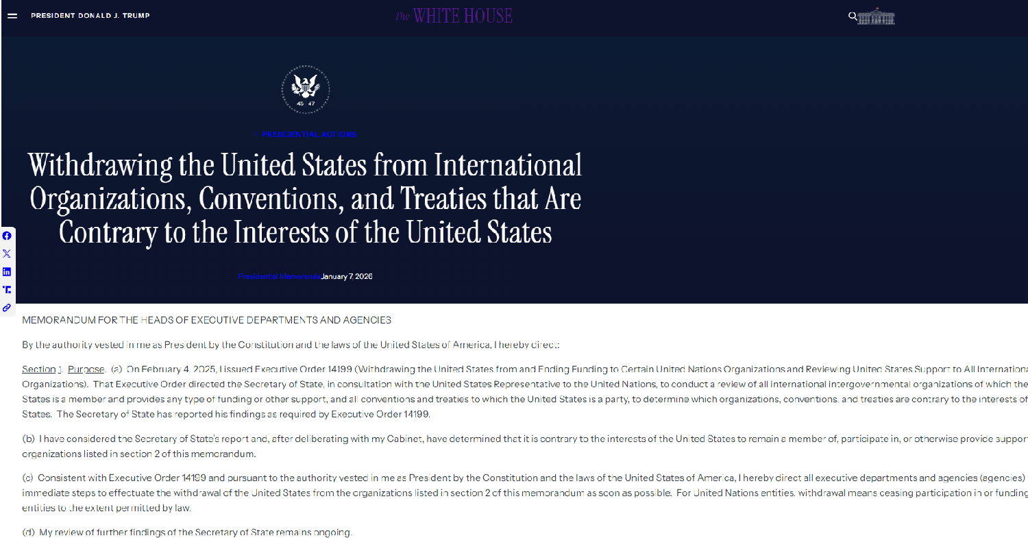 图为美国白宫7日发布美国政府启动退出66个国际组织、联合国机构以及多边机制的程序。(图/美国白宫官网截图)
