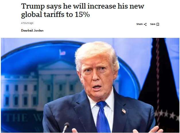 图为特朗普宣布对输美商品征收的“全球进口关税”税率将从10%提高到15%。(图/英国广播公司报道截图)
