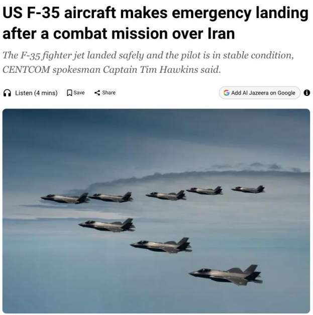 图为伊朗伊斯兰革命卫队宣布击中一架美军F-35型隐形战斗机。(图/卡塔尔半岛电视台报道截图)