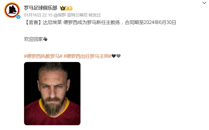 1月17日,在解雇穆里尼奥之后,罗马俱乐部官方宣布,聘请罗马名宿德罗西出任球队新的主教练,合同至2024年6月。