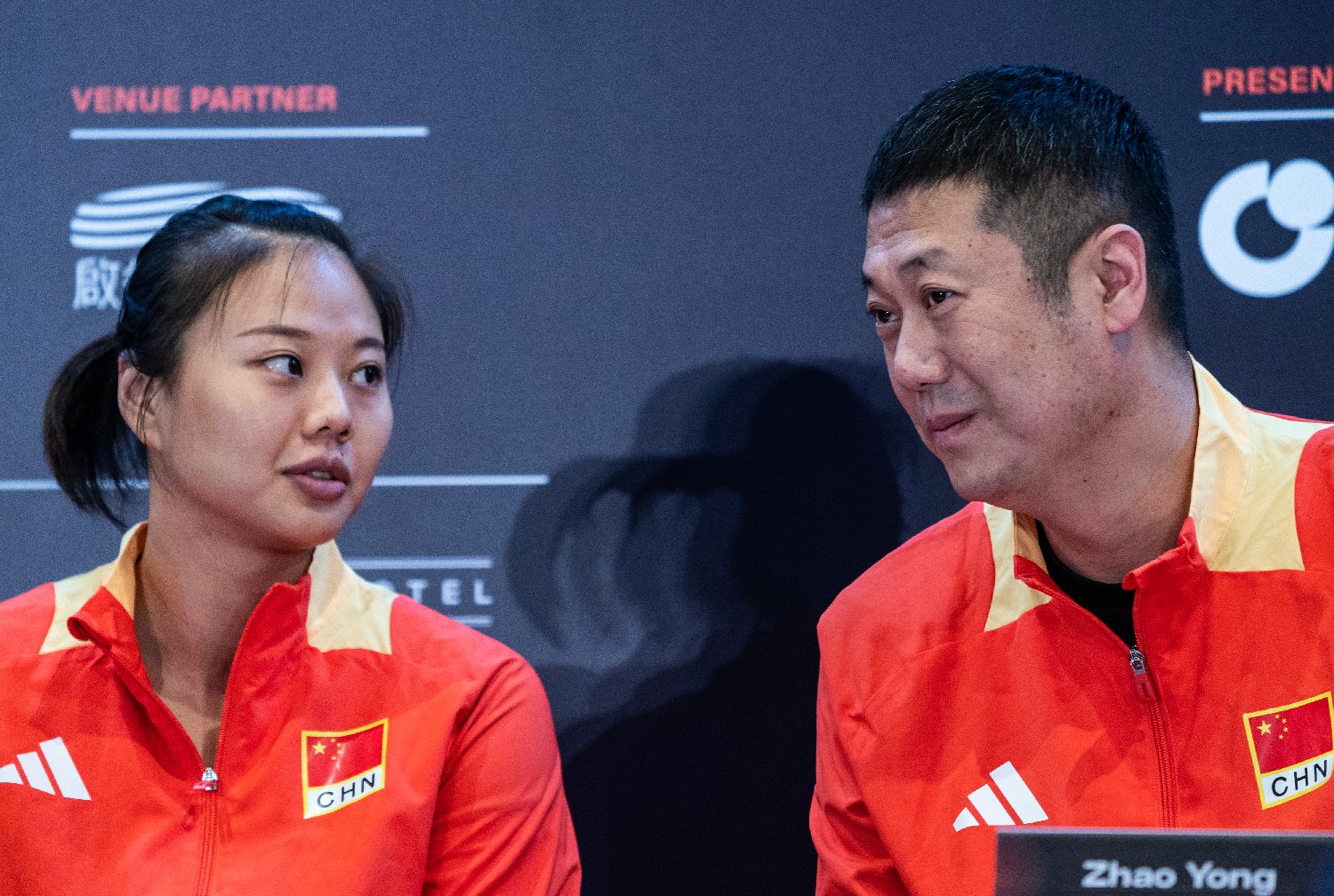 6月17日,世界女排联赛2025(中国香港站)赛前发布会在香港举行。中国女排主教练赵勇、队长龚翔宇和日本队、意大利队、捷克队、保加利亚队、泰国队队员代表出席,介绍各自备战情况并回答提问。图为赵勇(右)和龚翔宇交流。(图/中新社)