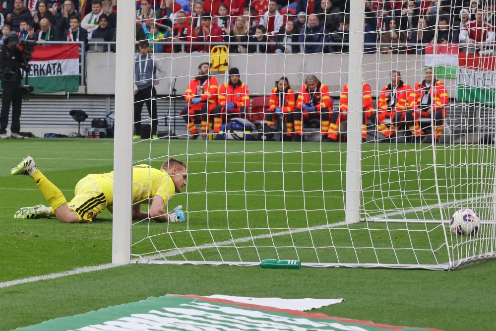 11月16日,匈牙利队守门员迪布什未能阻挡爱尔兰队进球。(图/新华社)