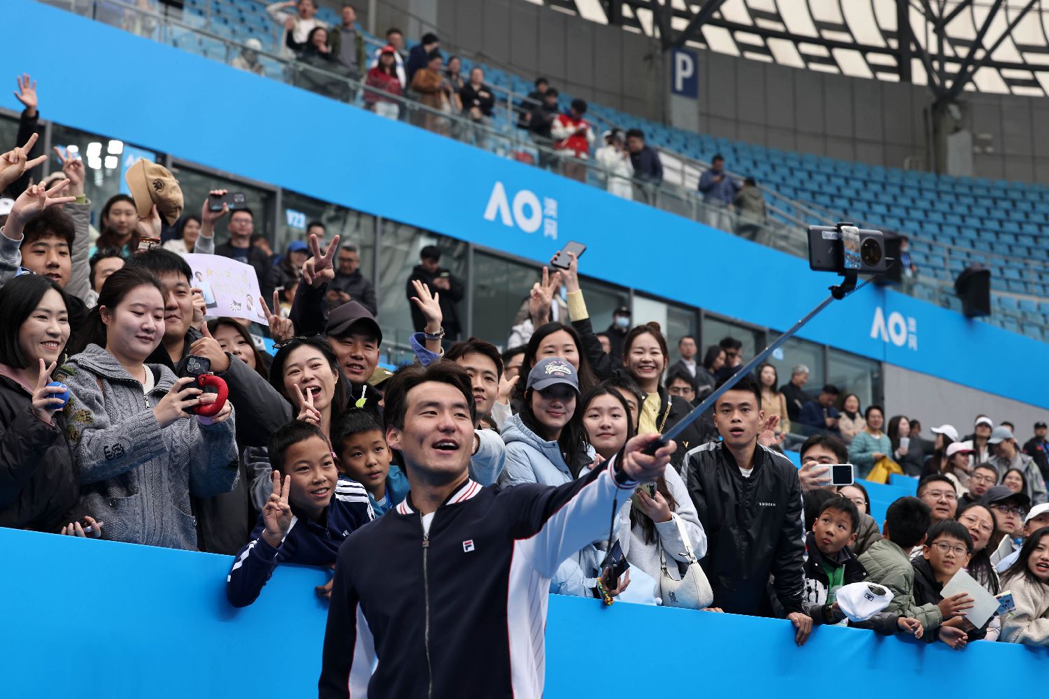 11月29日,2026澳网亚太区外卡赛男单决赛后,布云朝克特与球迷合影。(图/中新社)