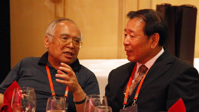 2014年一场公开活动上,陈寒枫(左)与中国战略文化促进会常务副会长兼秘书长罗援交流。(图/人民网)