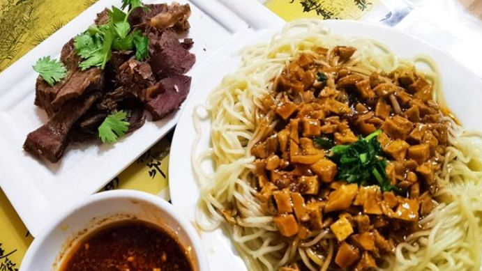 驴肉黄面实为两道菜,一盘驴肉作菜,配手工拉制的黄面作主食。黄面细如龙须、长如金线,柔韧耐拉,调汤或加菜食用,香味溢口。将驴肉与黄面融为一体,劲道的黄面、浓香的酱汁,正是敦煌民间流传至久的味道。