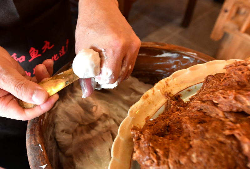 永和鱼丸制作技艺第四代传承人刘景舒双手配合默契,一粒圆滚滚的丸子很快就出自他手。
