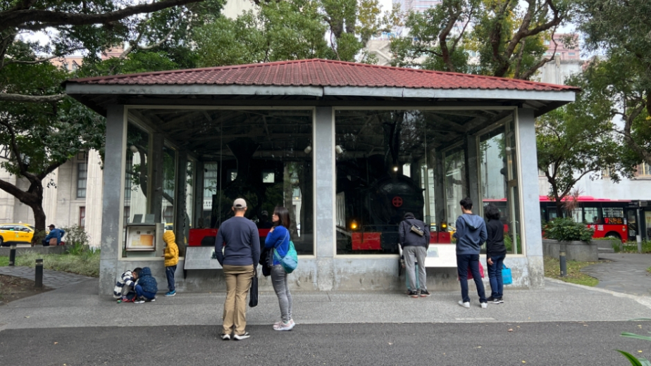 1月1日,游人在距台北车站不远处的一个公园里,参观园内展示的台湾铁路第一号蒸汽机车“腾云”号及第九号蒸汽机车。
