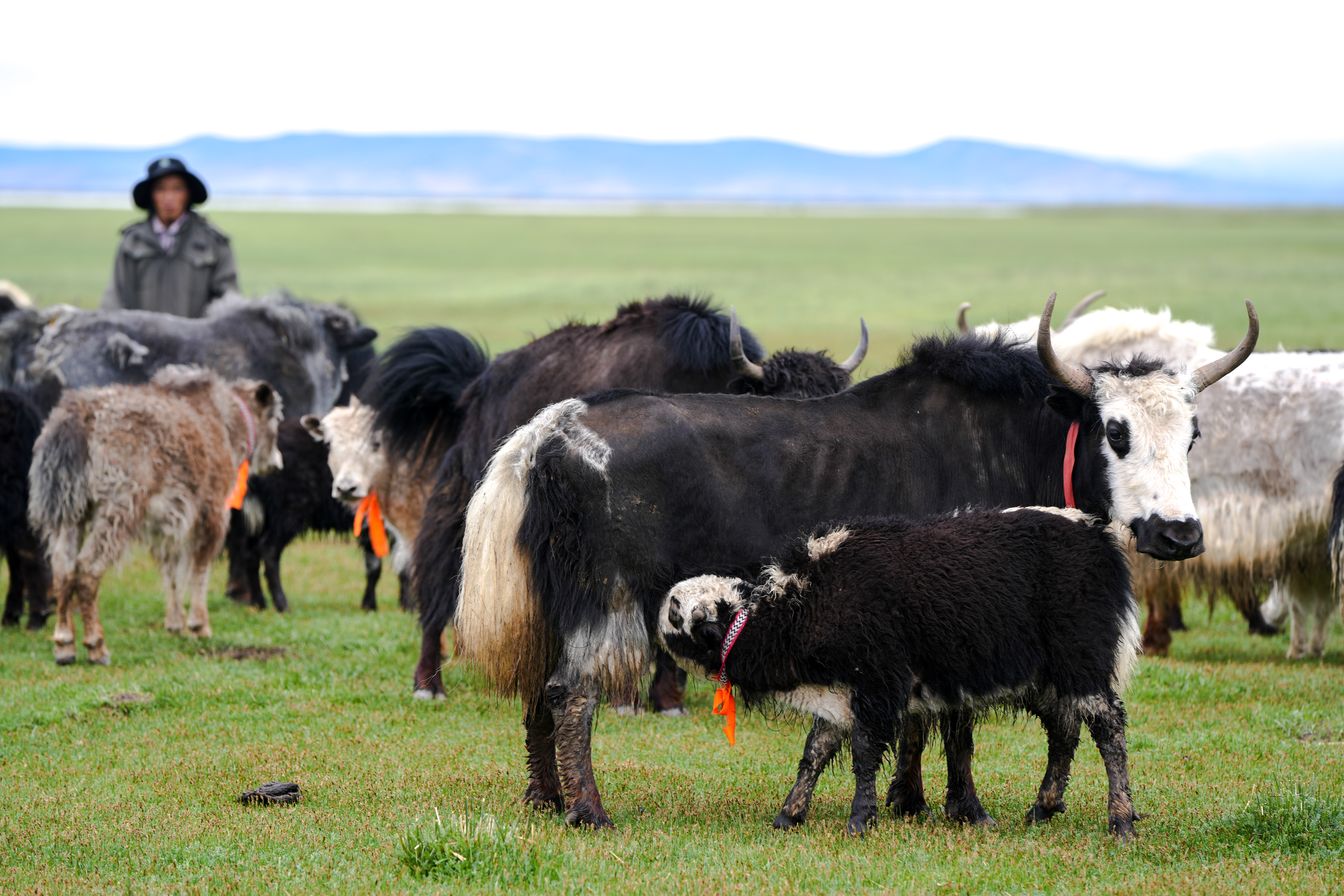 7月22日,在西藏阿里地区普兰县霍尔乡玛旁雍错湿地,一头牦牛在喂养牛犊。(图/澳洲网)