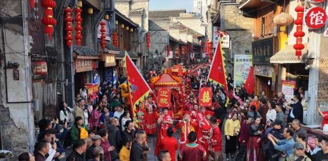 红灯笼沿青石板路次第排开,中国结在微风中轻摇,花瓣红毯从资江码头绵延至古街深处......16日,随着三声震天鼓响,湖南省第十一届国潮集体婚礼在娄底新化县上梅古镇向东街启幕,100对身着传统喜服的新人携手踏过红毯,在千年古街的见证下许下相守承诺。