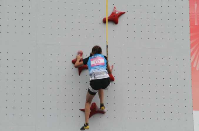 图为西藏队次旦旺姆在十五运会攀岩项目女子速度攀岩预赛赛场上。(图/“统战新语”微信公号)
