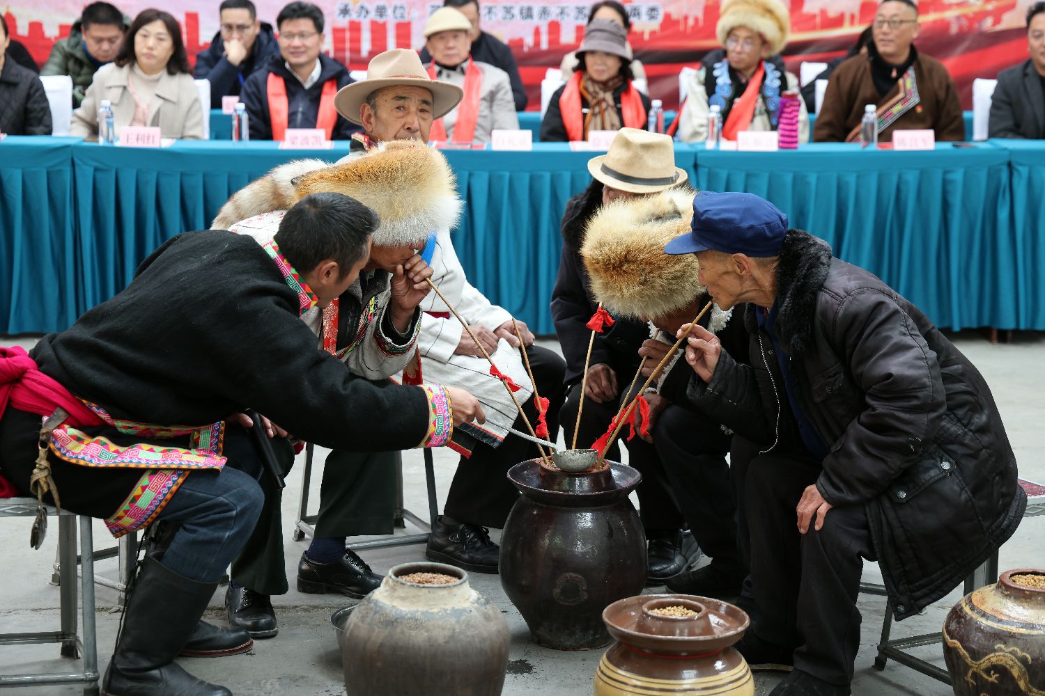 “咂酒由青稞等粮食发酵而成,是羌族待客珍品,羌年欢聚也必不可少。”赤不苏村村民委员会副主任王永富介绍,咂酒由族中长者主持开坛,用细长竹竿插入陶罐咂引。酒坛从尊长开始依次传递,情感也在传递中凝聚升温。