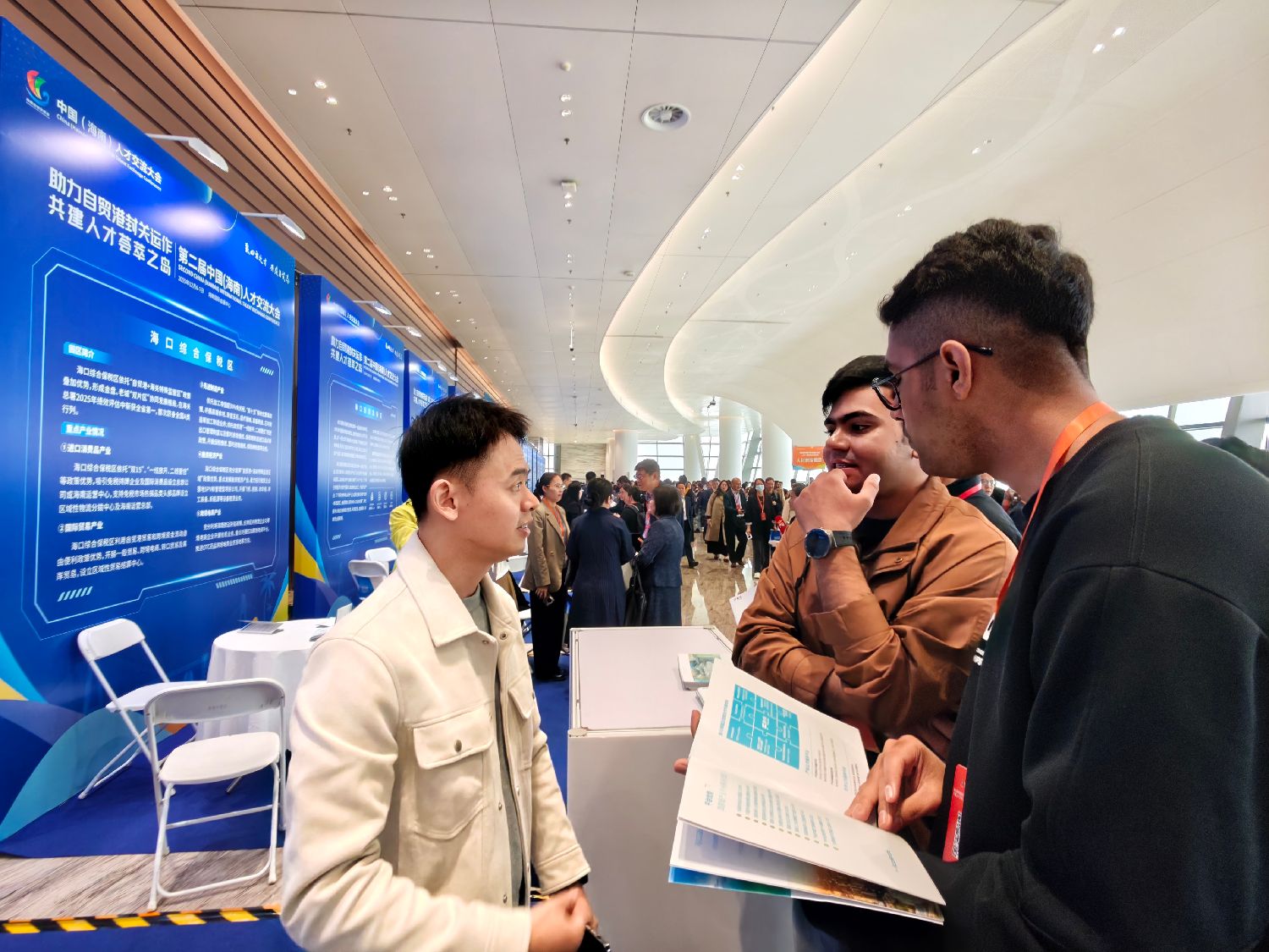 图为12月6日,外籍人才在第二届中国(海南)人才交流大会上与企业交流。(图/中新社)