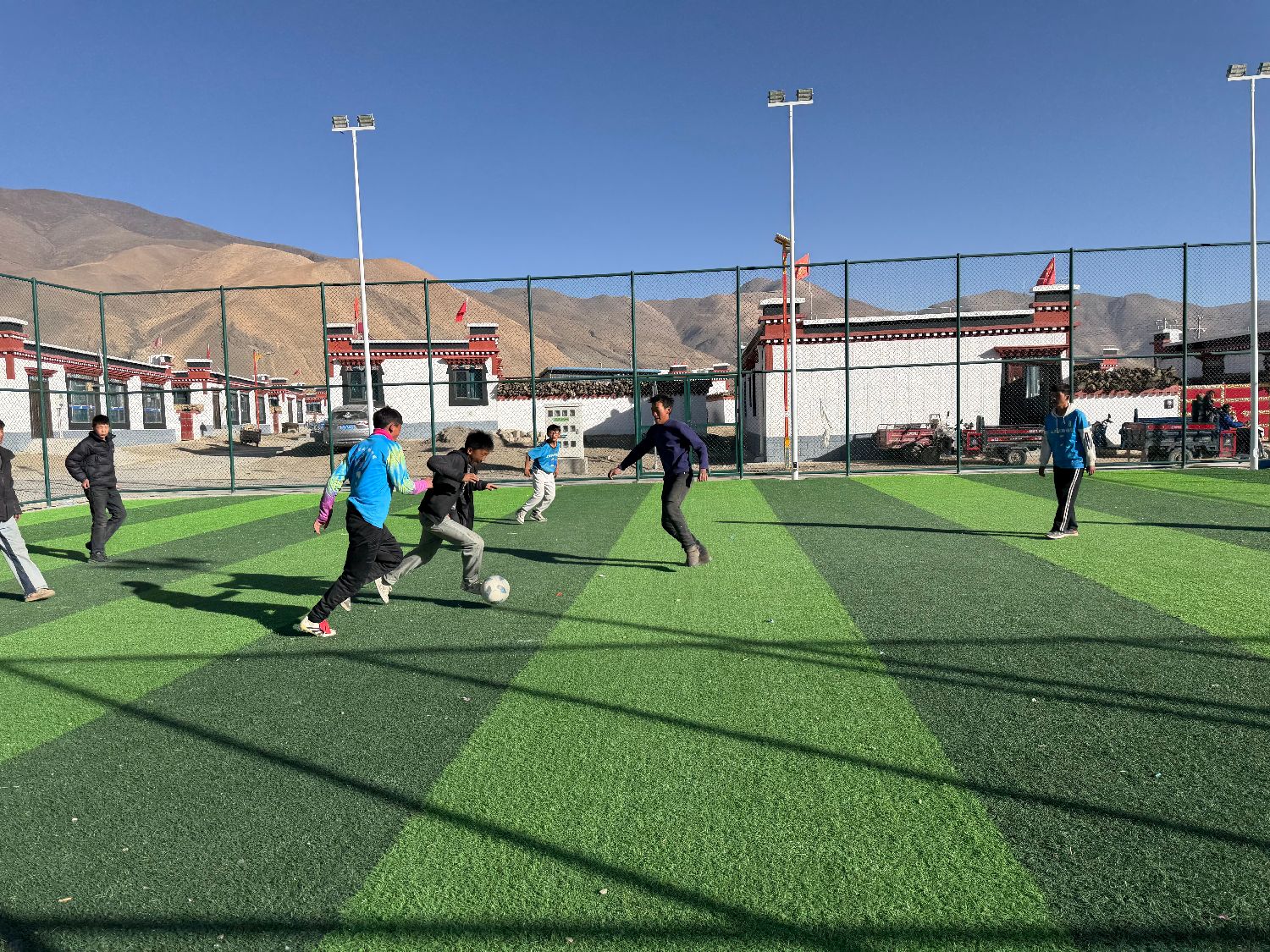 图为1月5日,森嘎村球场上,孩子们在踢球。(图/中新社)
