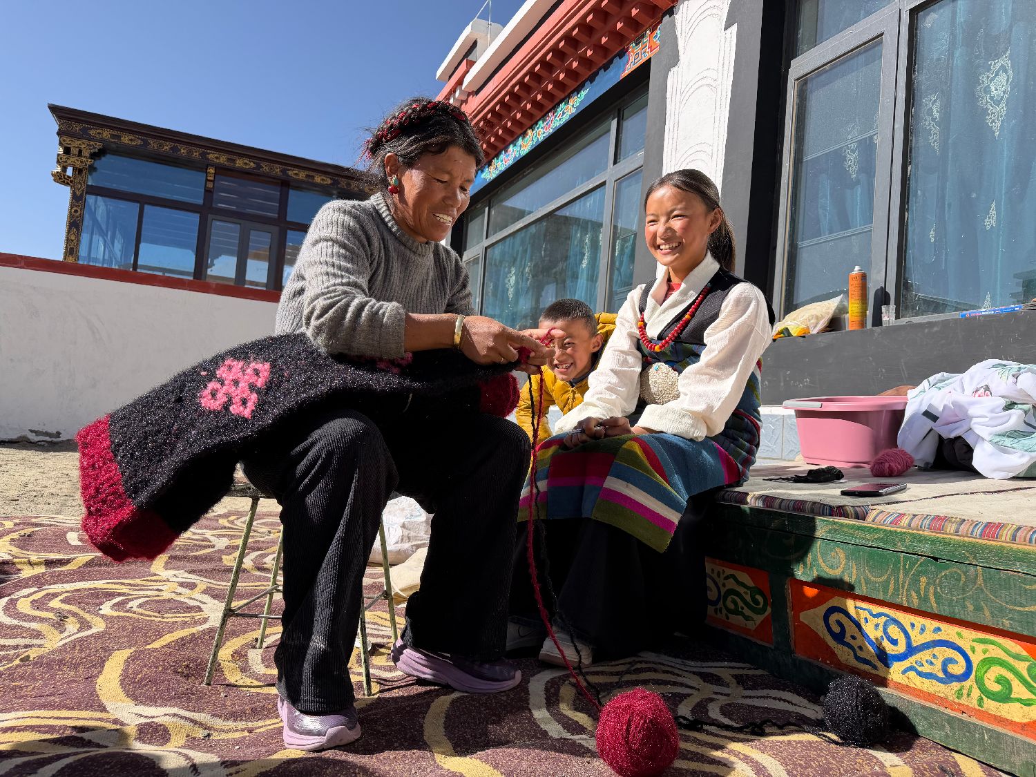 图为1月5日,森嘎村的卓玛(左一)在院子里晒着太阳织毯子。(图/中新社)