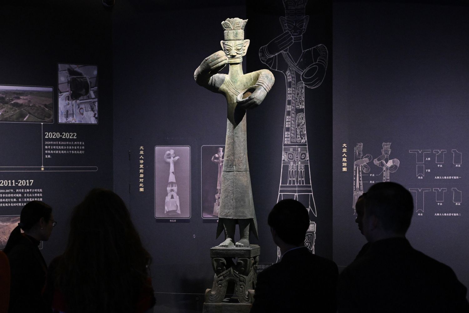 现场展出的两组六个青铜人头像颇为壮观,细心的观众会发现头像的发式不同。有观点认为,辫发族群可能主持军事行政等世俗事务,笄发族群则掌控宗教与祭祀事务,到金沙时期,辫发族群取代笄发族群,执掌社会的宗教事务。