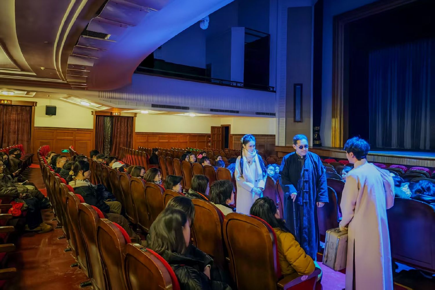 《夜半伶歌》执行导演董航认为,置身一座已有90年历史的老戏院,“只用舞台太可惜”。团队将演出设计为行进式,向观众开放平时很少示人的“幕后”空间,把开台等传统元素融进观演动线,“让观众看到平时看不到的东西”。