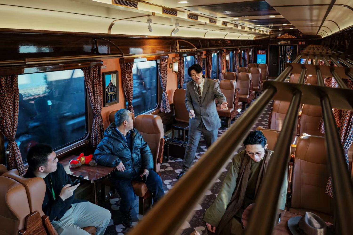 登车后,身着复古装束的演员会引导乘客进入不同主题的车厢。比如,一节车厢正在上演青年剧作家陷入灵感危机,与编辑争论不休的剧情,争执间,演员会走到乘客身边并作简短互动。观戏与演戏交叠,车上人皆是剧中人。