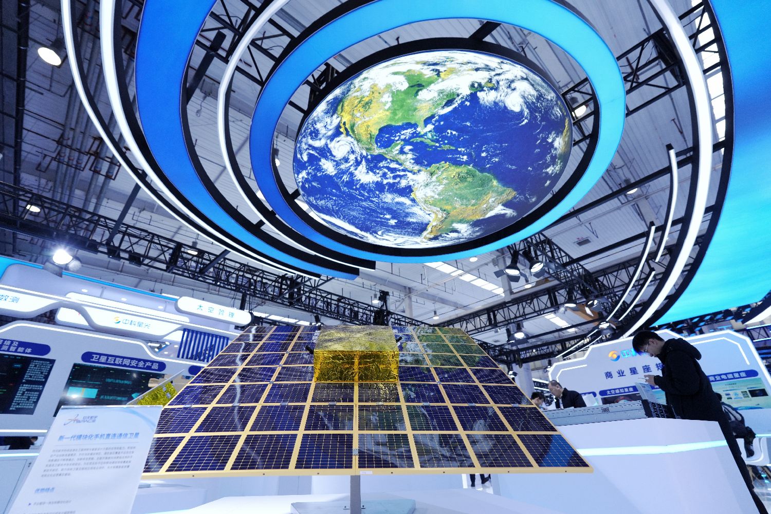1月23日,2026北京国际商业航天展在北京亦庄开幕。本届展会集中展示运载火箭、卫星研制、测控服务、载荷应用、空间探测及地面设备等商业航天全产业链创新成果。图为展出的新一代模块化手机直连通信卫星。(图/中新社)