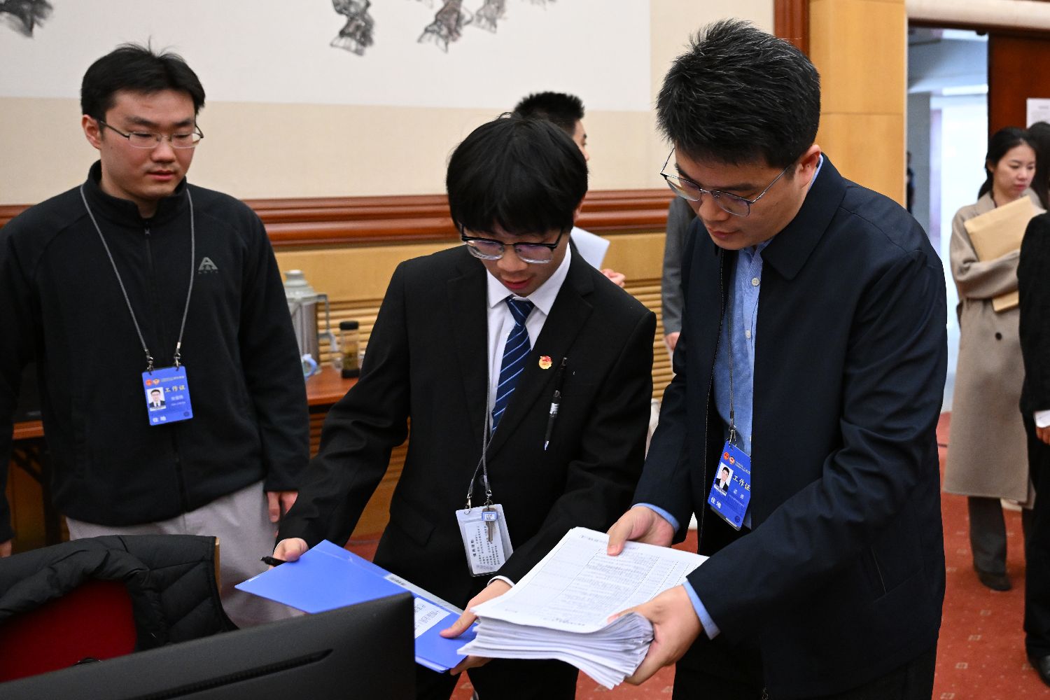 图为3月10日,北京,十四届全国人大四次会议秘书处议案组工作人员在交接香港代表团的建议原件。(图/中新社)