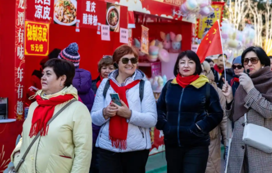 图为2月17日,外国游客在北京龙潭湖公园逛春节文化庙会。(图/新华社)