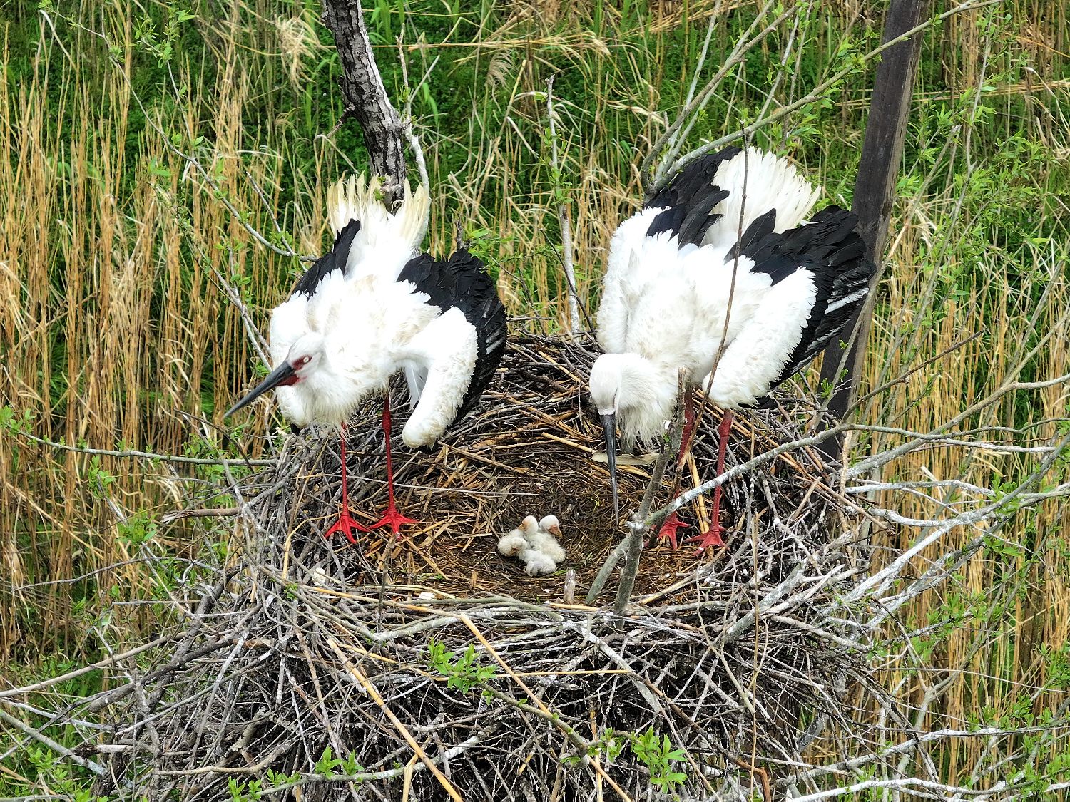 图为3月18日,南洞庭湖自然保护区舵杆洲区域,东方白鹳孵化出三只幼鸟。(图/中新社)