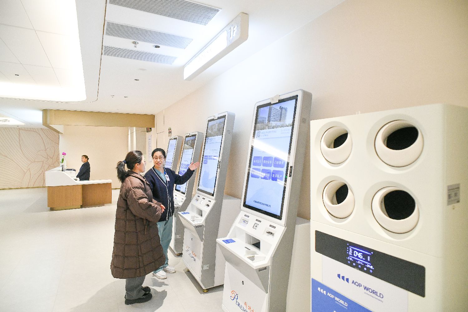 图为2月26日,天津,医护人员在医院一楼大厅自助服务区指导患者使用自助挂号机。当日,由新加坡鹏瑞利集团全资建设的中国首家外商独资三级综合医院天津鹏瑞利医院正式开诊。(图/中新社)